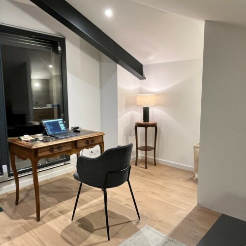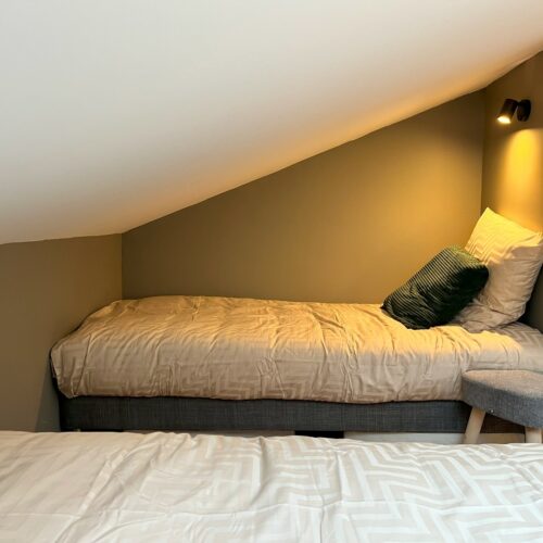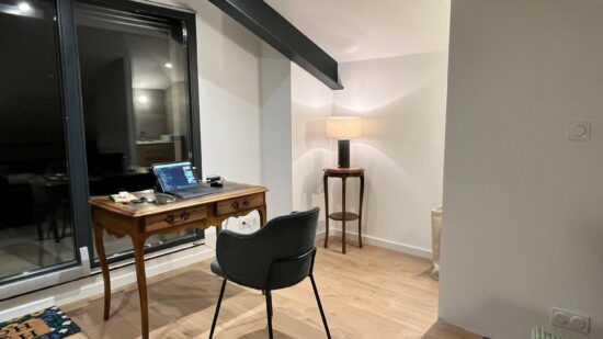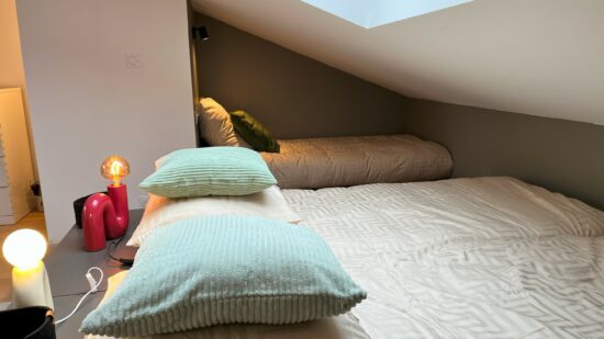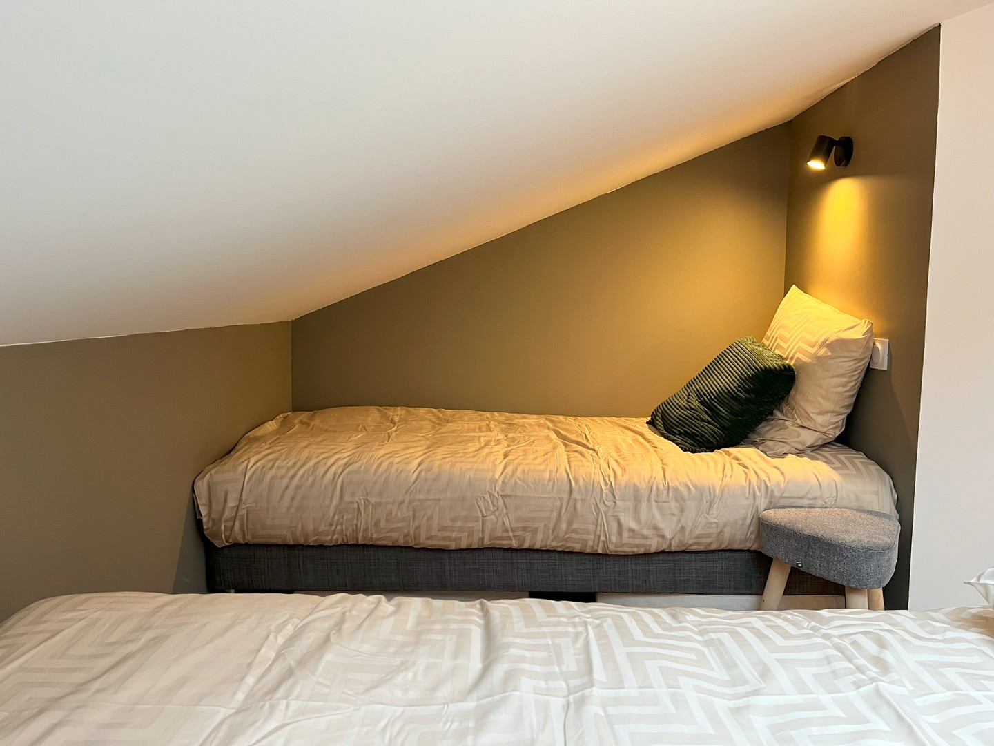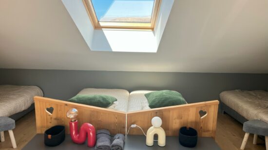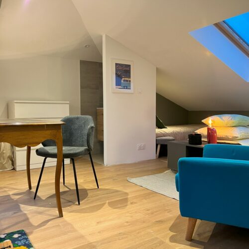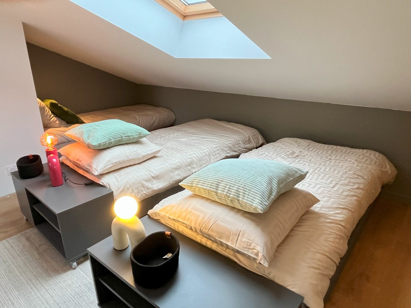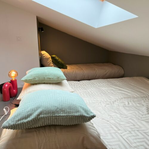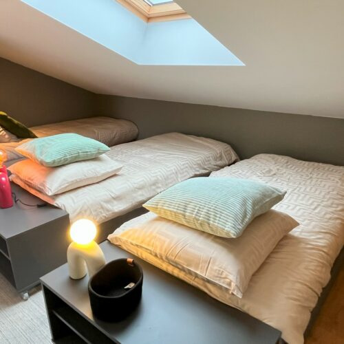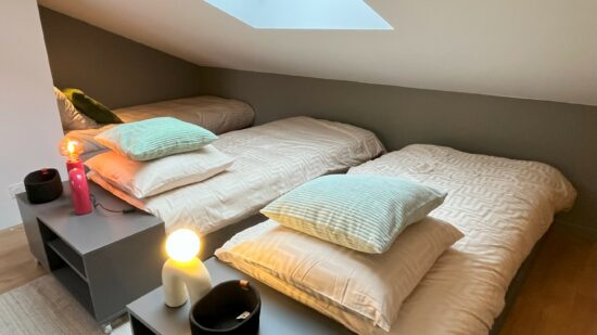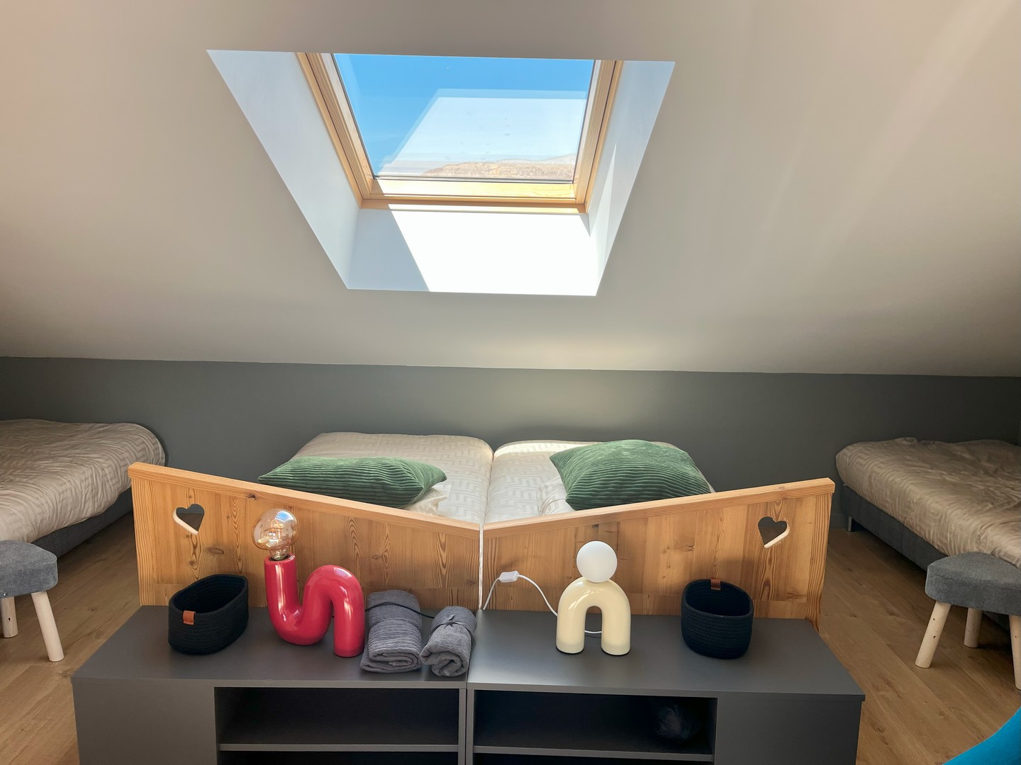 Située au dernier étage de la villa, cette suite propose quatre lits simples. Idéal pour les randonneurs de passage. Un coin lavabo pour la toilette, un espace jeux vidéos, télé ou films, un bureau et surtout une vaste terrasse avec un confortable salon de jardin.