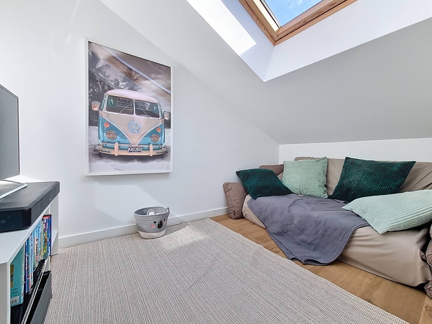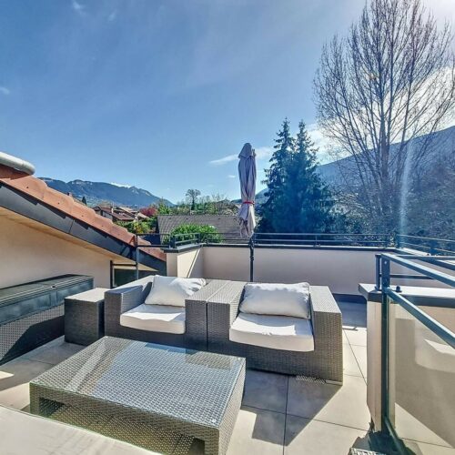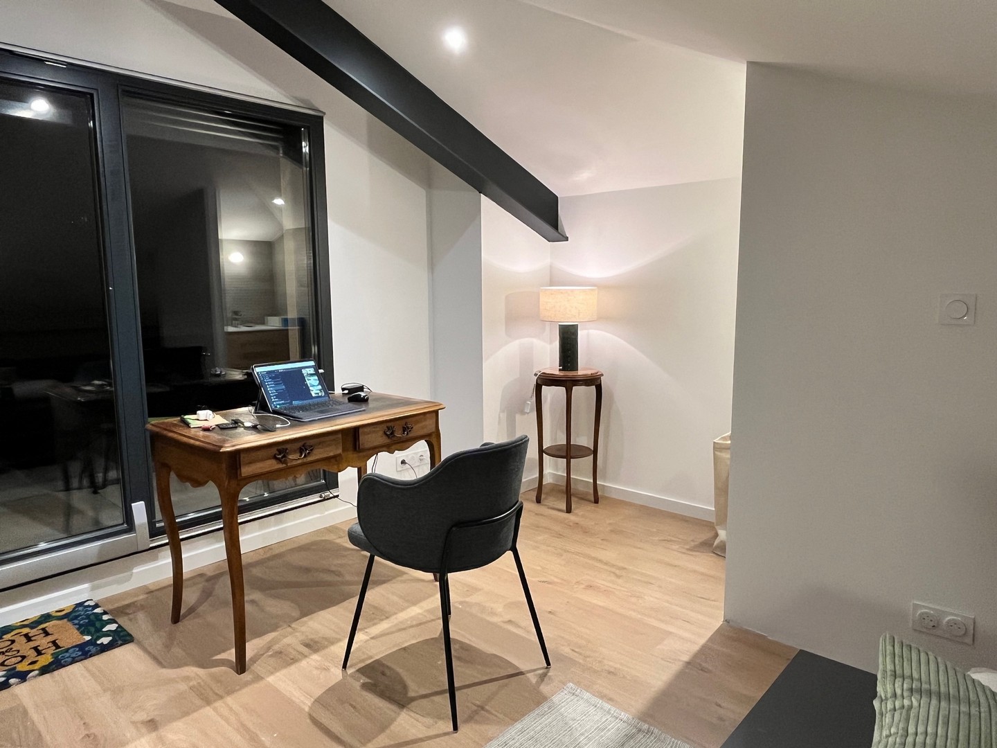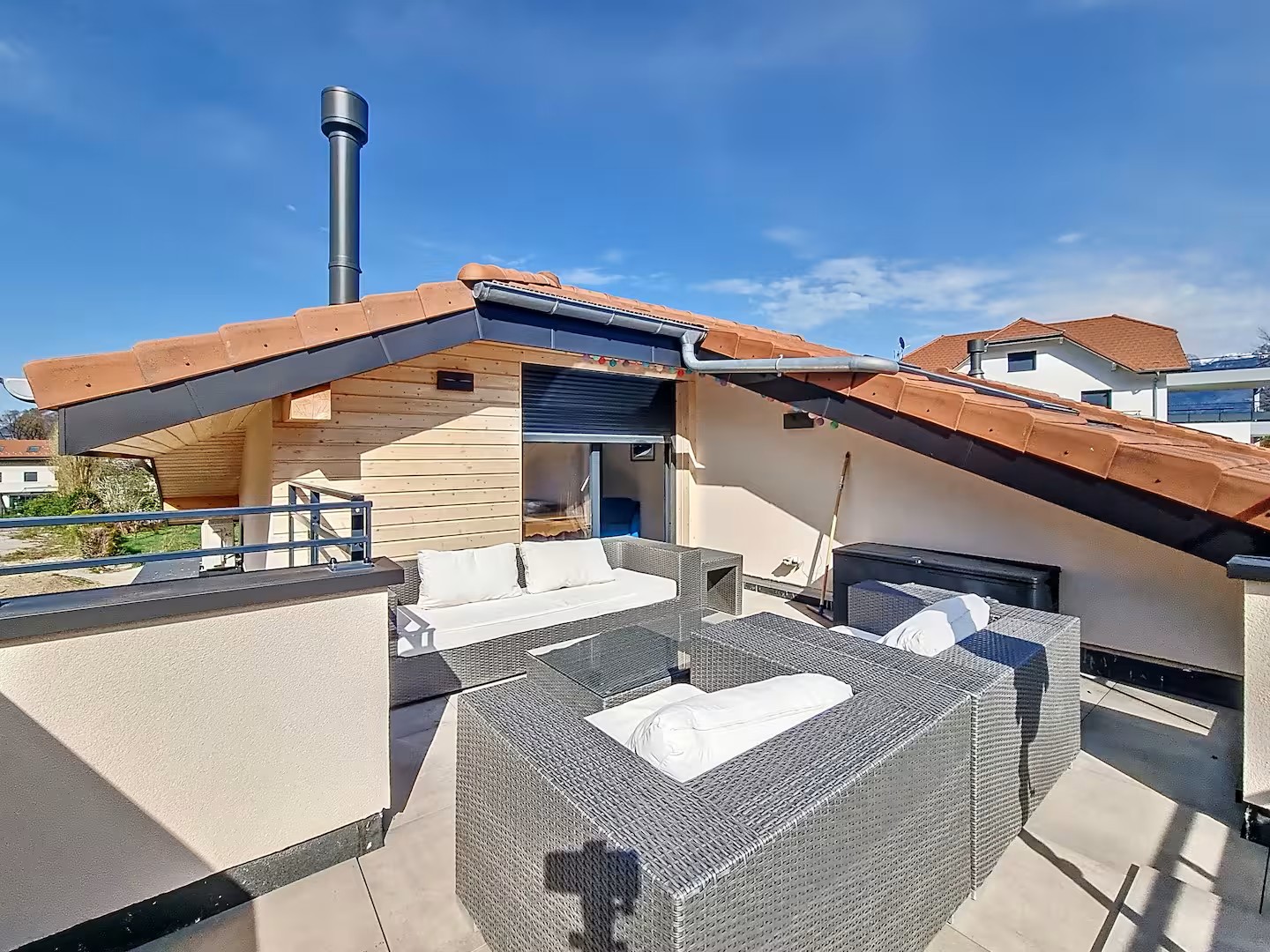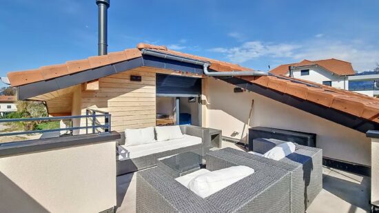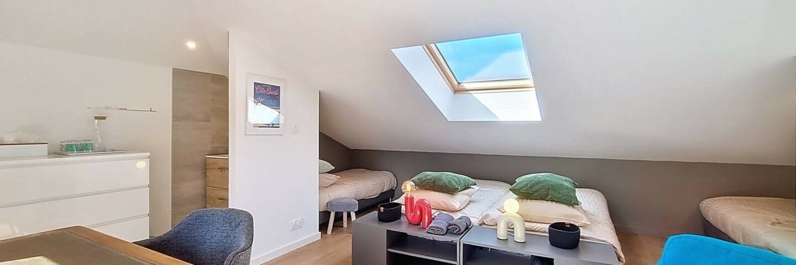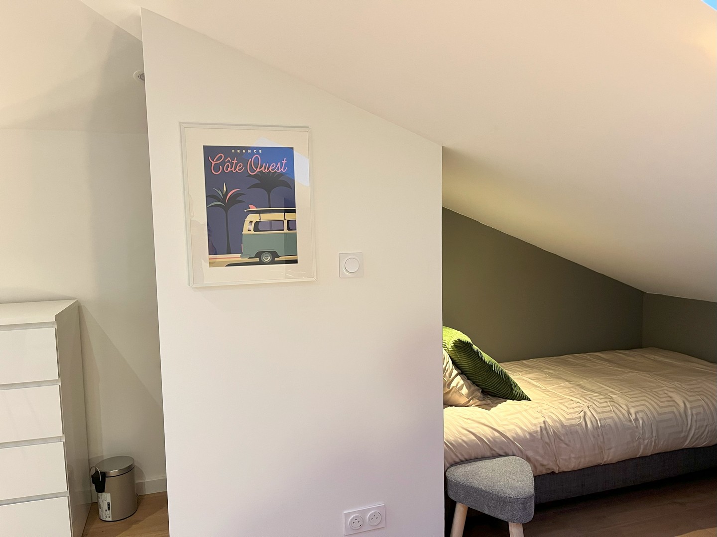 Située au dernier étage de la villa, cette suite propose quatre lits simples. Idéal pour les randonneurs de passage. Un coin lavabo pour la toilette, un espace jeux vidéos, télé ou films, un bureau et surtout une vaste terrasse avec un confortable salon de jardin.