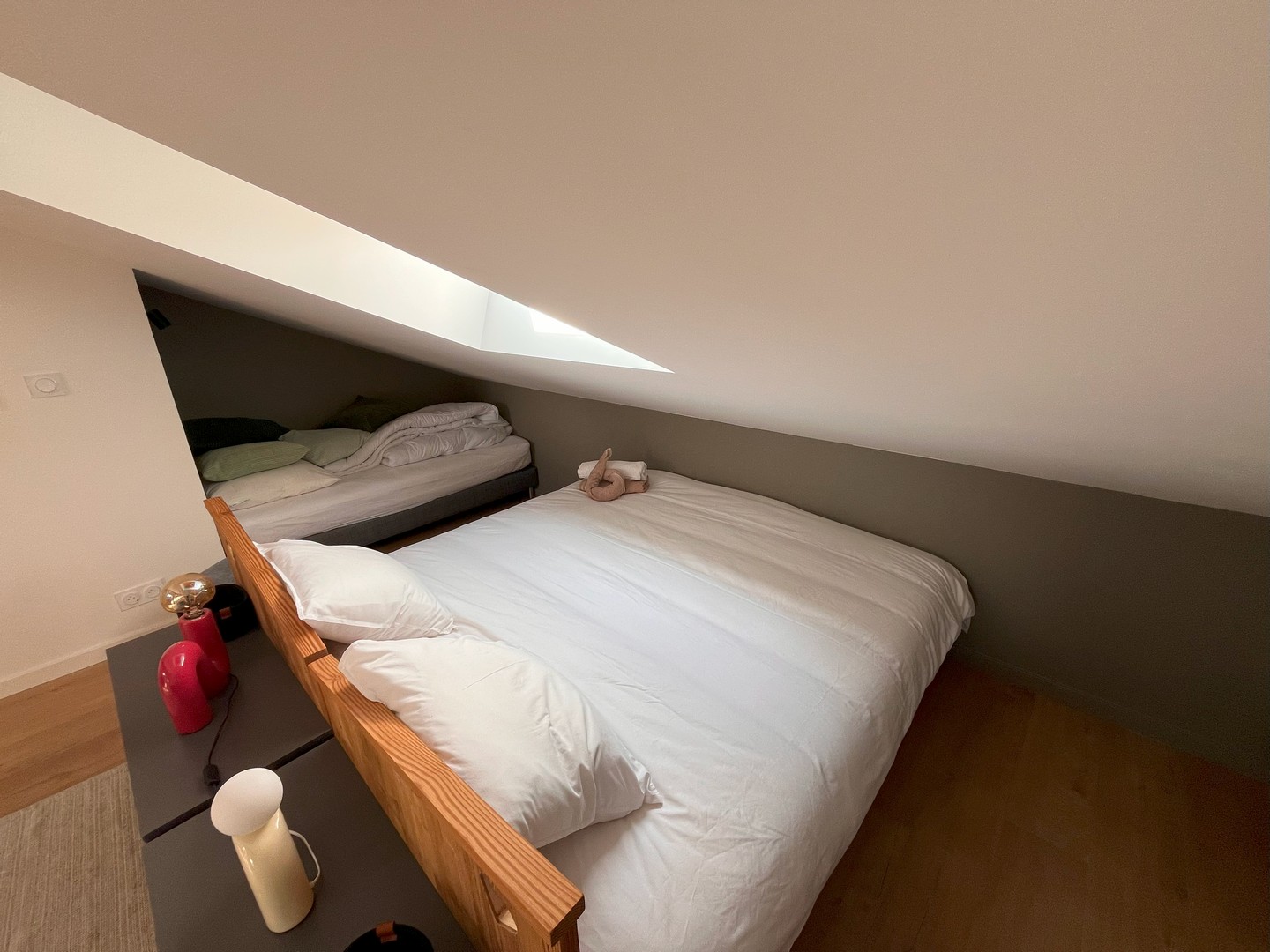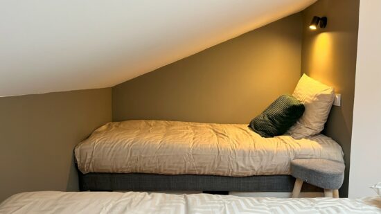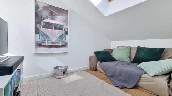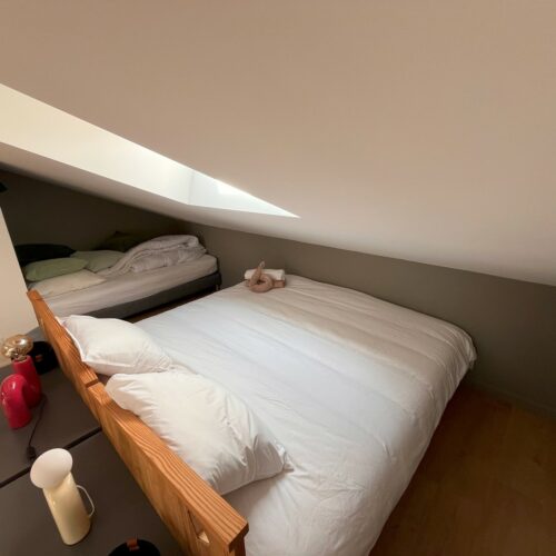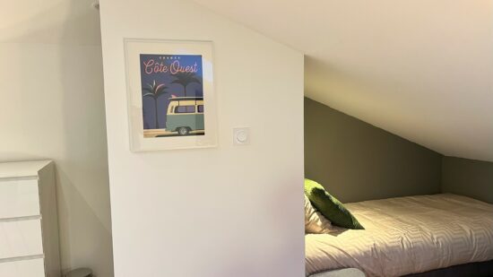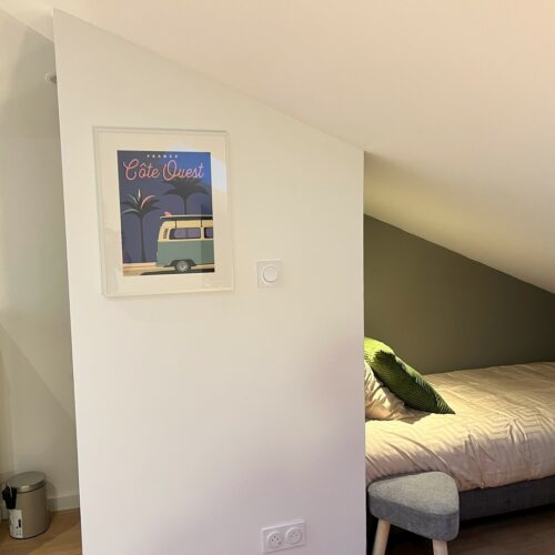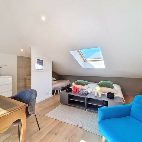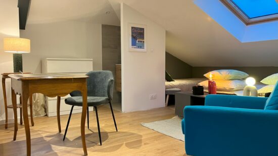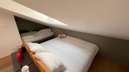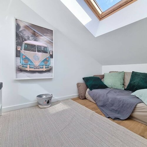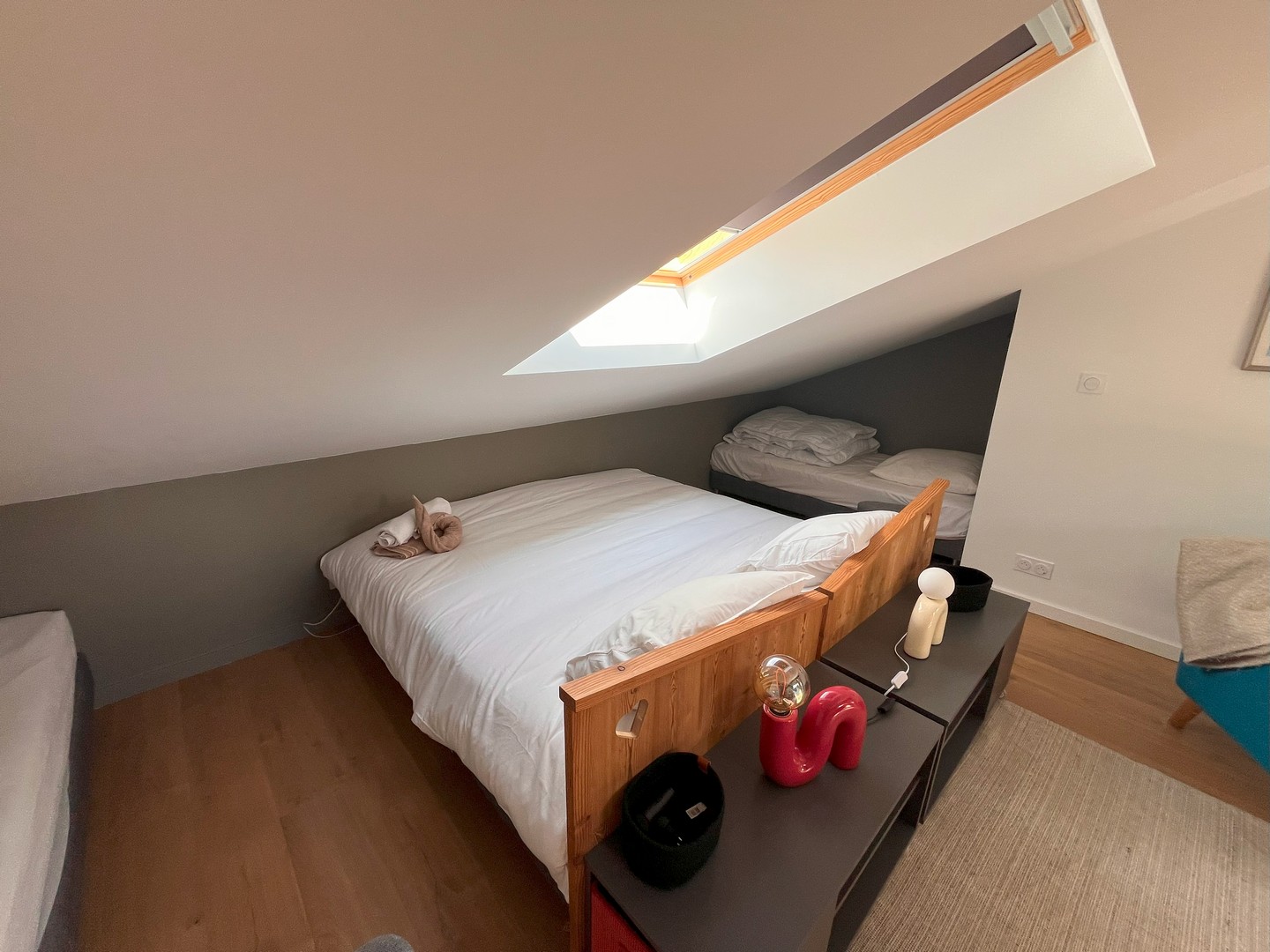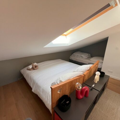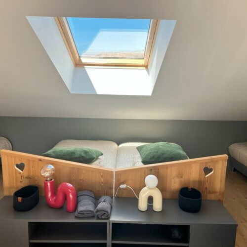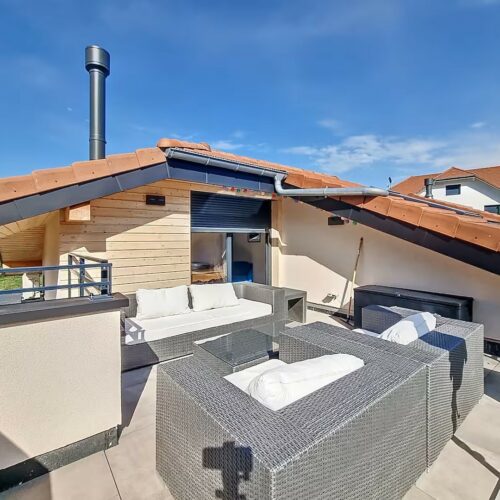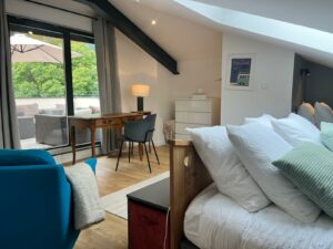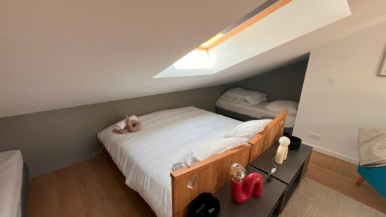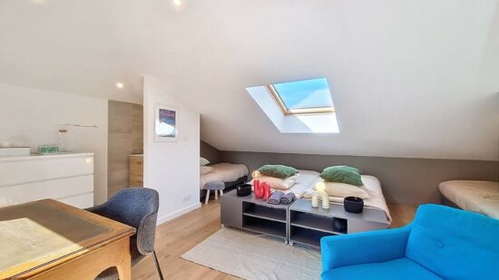 Située au dernier étage de la villa, cette suite peut se configurer en quatre lits simples ou un lit king size central et deux lits simples. Un coin lavabo pour la toilette, un espace jeux vidéos, télé ou films, un bureau avec connexion Ethernet et surtout une vaste terrasse avec un confortable salon de jardin.