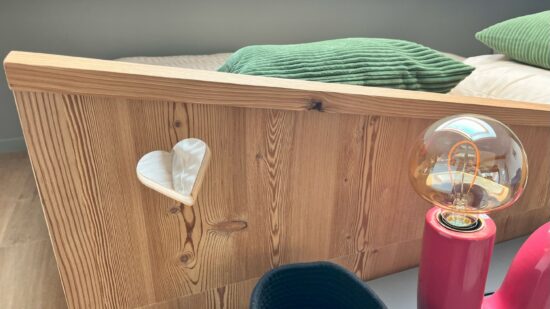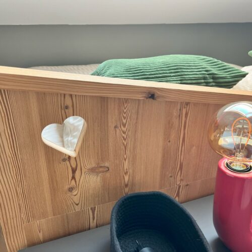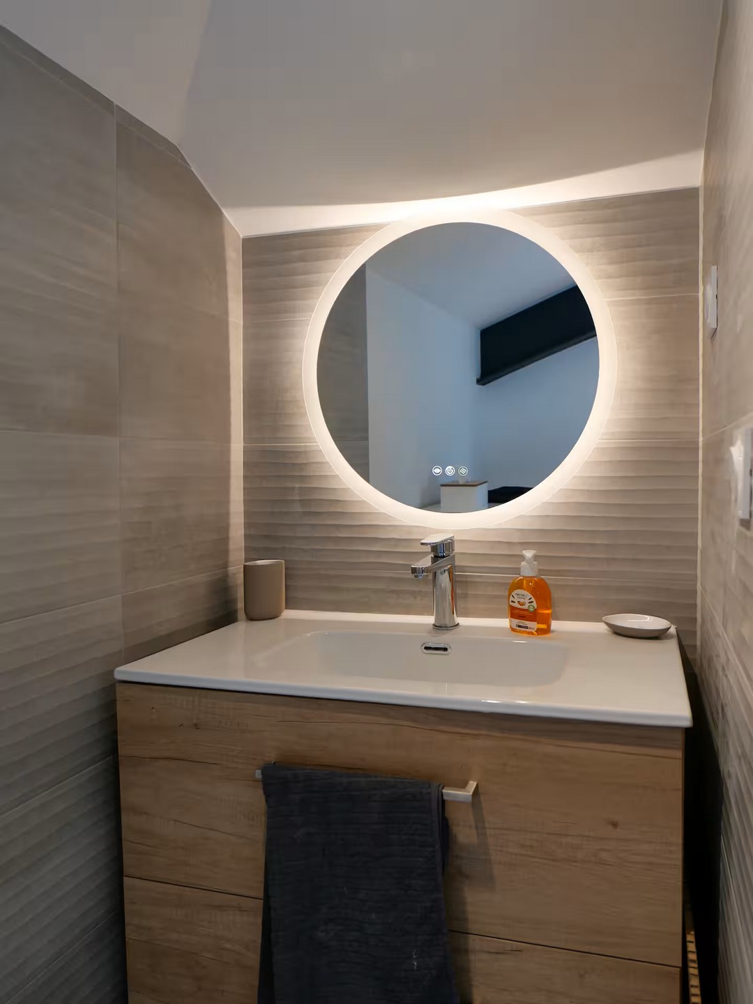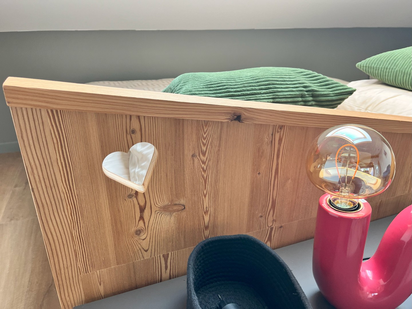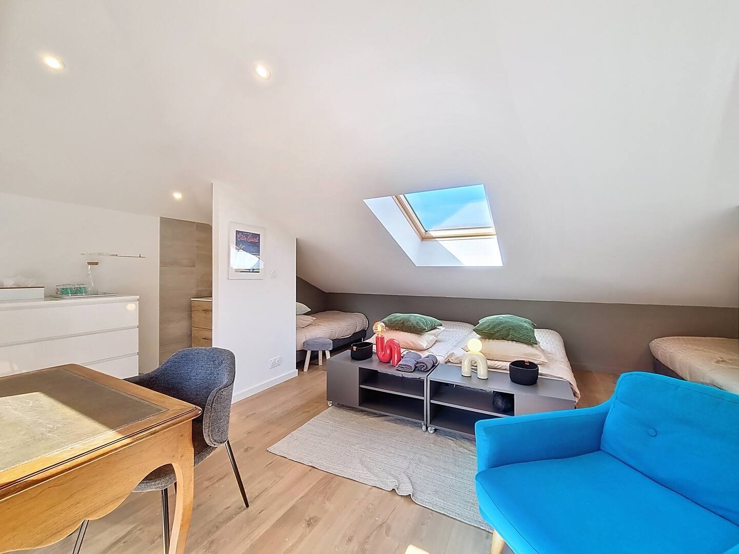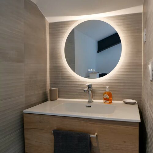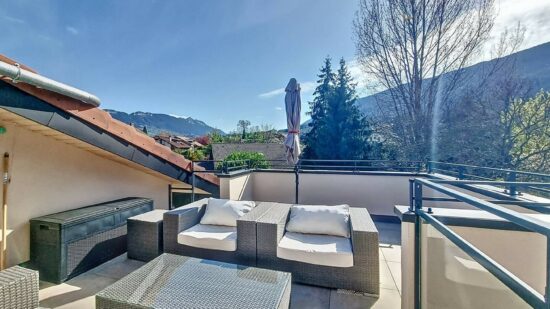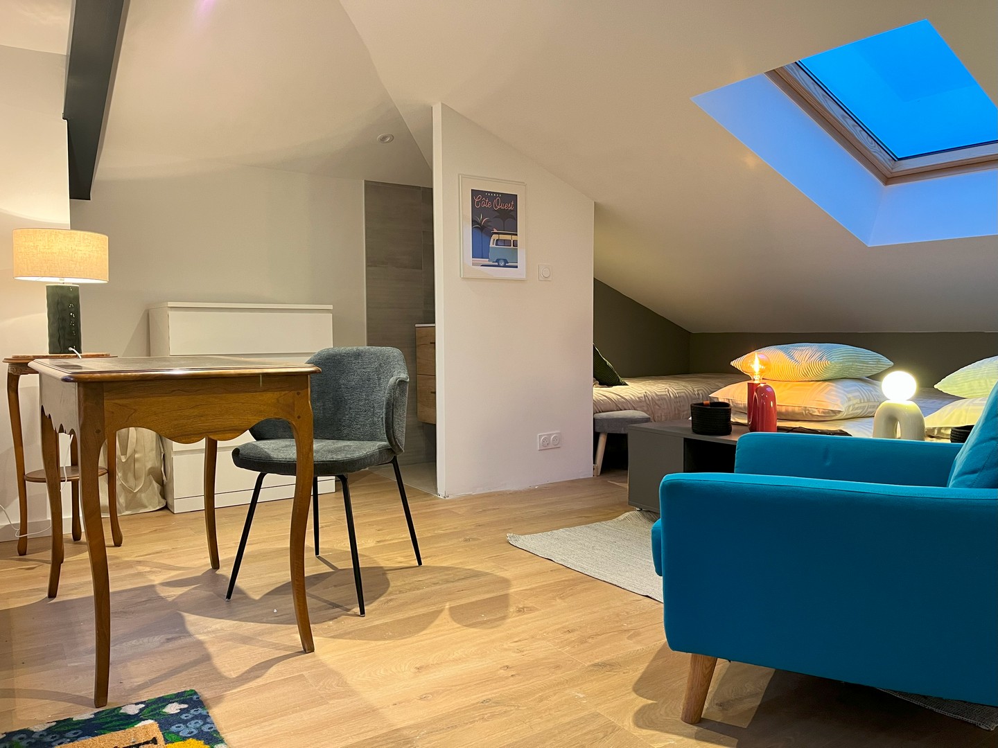 Située au dernier étage de la villa, cette suite peut se configurer en quatre lits simples ou un lit king size central et deux lits simples. Un coin lavabo pour la toilette, un espace jeux vidéos, télé ou films, un bureau avec connexion Ethernet et surtout une vaste terrasse avec un confortable salon de jardin.